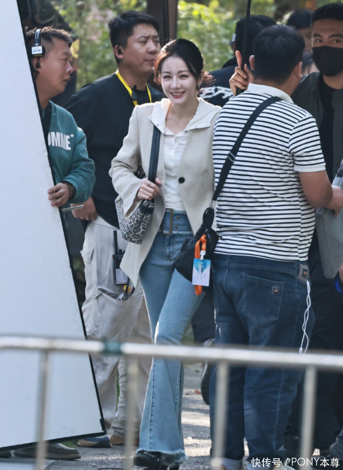 浅蓝修身喇叭牛仔裤 + 单肩包,显腿长又添随性下半身的浅蓝修身喇叭牛仔裤,是整套造型的 “显腿长神器”。修身的版型精准贴合腿部线条,勾勒出迪丽热巴修长笔直的双腿,从大腿到脚踝的渐变收紧设计,避免了紧身裤的紧绷感,又能凸显腿部曲线;喇叭裤脚的微阔设计则增添了复古感,与浅米色西装的温柔气质相呼应,同时悄悄修饰脚踝线条,让整体身形更显修长。浅蓝色调清新柔和,与上装的浅米色、白色形成和谐统一的色彩搭配,没有强烈的色彩碰撞,却透着满满的舒适感,完美契合 “松弛精致” 的整体风格。